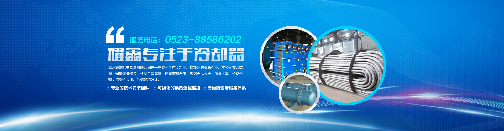 免費(fèi)咨詢方案 +泰州耀鑫機(jī)械制造有限公司座落于風(fēng)景如畫的江蘇魚米之鄉(xiāng)--全國(guó)文明城鎮(zhèn)婁莊鎮(zhèn),是一家專業(yè)生產(chǎn)風(fēng)冷卻器、列管式冷卻器、板式冷卻器的企業(yè)。本公司實(shí)力雄厚、制造設(shè)備精良、檢測(cè)手段完善、質(zhì)量管理嚴(yán)密、系列產(chǎn)品齊全、質(zhì)量可靠、價(jià)格合理,深受廣大用戶的信賴和好評(píng)。